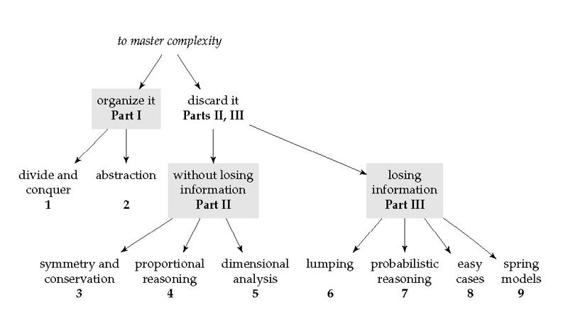 Mahajan has crafted his book based on his own teaching experiences and subsequent pedagogical revelations. A subtle shift in perspective led to a focus on teaching reasoning tools (one per chapter over nine chapters in total) and how to apply such tools to various topics, rather than the other way round starting with a list of topics from the physical sciences and then learning how to solve problems from each of those topics. The chapters are organized as shown in the following diagram taken from the preface: