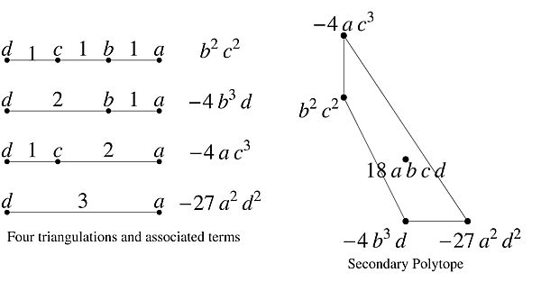 The case of general degree d with coefficients c0, ..., cd is similar. All terms have total degree 2d –2 . The sum of the indices on the 2d–2 factors is d(d–1). A-triangulations of Q = [0,d] are indexed by subsets of {1,...,d–1} and are all coherent. Accordingly, extreme monomials are indexed by subsets of {1,...,d–1} according to which ai appear. The monomial indexed by {1,...,d–1} itself is c12 ... cd–12 . In general, listing out the exponents which appear in increasing order, to pass from the extreme monomial indexed by a set S = {...,u,v,w,...} to the extreme monomial indexed by S – {v} = {...,u,w,...} one replaces the factor cvw–u by the factor cuw–v cwv–u. The secondary polytope is thus combinatorially an (m–1)-dimensional cube. As d = 3, 4, 5, 6, 7, ... increases, the number of terms in the discriminant increases rapidly: 5, 16, 59, 246, 1103, ...