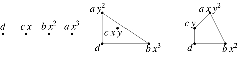 This response is inadequate, as it does not fully capture the multidimensionality of the situation. To give a better response, let's first give ourselves extra flexiblity by allowing negative exponents as well. Given a Laurent polynomial f(x1,...,xm), let A ⊂ Zm be the set of exponents for which the corresponding coefficient is non-zero. A better response focuses on the Newton polytope associated to the polynomial, namely the convex hull Q of the set A of contributing exponents. Our three quadrinomial examples are illustrated by the following figure: