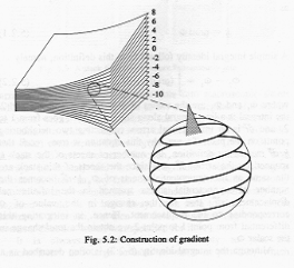 At times, it’s also illuminating. Consider, for example, how Weinreich defines the gradient of a scalar field (i.e., a function of three variables). He represents the scalar field as a collection of level surfaces in three-dimensional space. There is a natural orientation to these surfaces, at least locally: “up” is in the direction of larger values of the function. To compute the gradient, one takes a “melon baller” and scoops up a bit of this picture around a point. Locally, the surfaces all look like planes, so this is a stack of planes with an orientation: a stack vector! This stack vector is the gradient of the scalar field at that point. And notice that since the thing one does most often with the gradient is to compute its dot product with arrows (in order to get a directional derivative), making it a stack vector is just what we want. I was somewhat amazed that this gives the correct differential operator. In particular, I find it very nice that the limit process is hiding in the local linearization that’s implicit in the description.