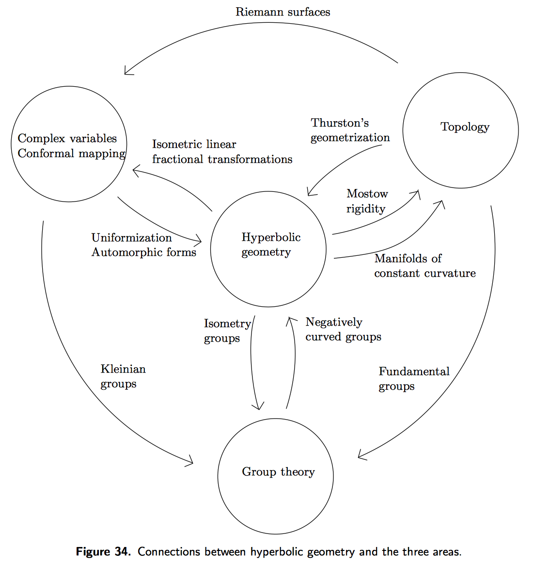 Hyperbolic surfaces or 3-manifolds are quotients of 2- or 3-dimensional hyperbolic (constant negative curvature) space by torsion-free discrete subgroups (known as Fuchsian or Kleinian groups) of their respective isometry groups. Poincaré, Fricke, and Klein were among the earliest explorers of the great expanse of mathematics that related to the study of such objects, from the time of their birth in the late 19th century. The diagram on the left, taken from Cannon-Floyd-Kenyon-Parry’s excellent introduction to Hyperbolic Geometry in Flavors of Geometry (MSRI Pub. Vol. 31, 59-115), gives the reader a bird’s eye view of this rich terrain.