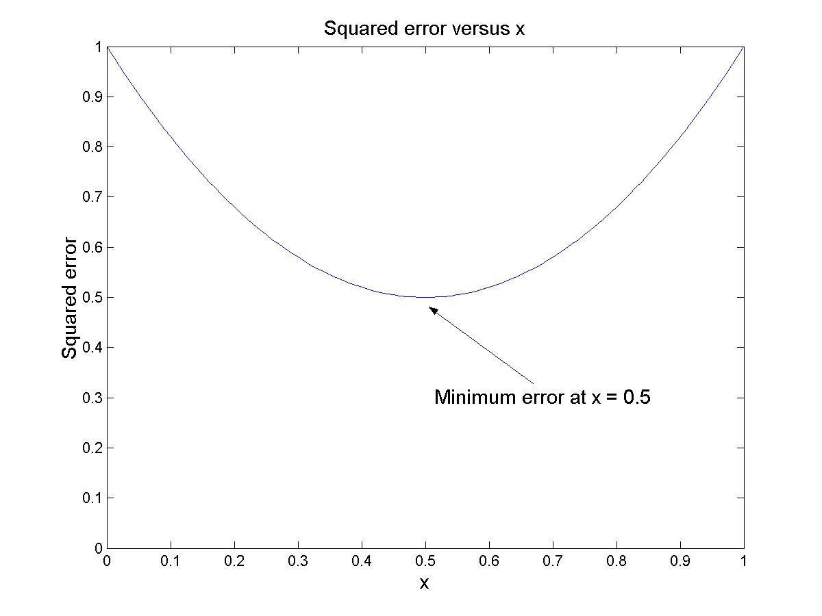 So we find \(x = \frac{1}{2}\). In fact, we can write the squared error as \(E\) where: \[ E = \left( x- 1 \right)^2 + \left( x - 0 \right)^2 \] and if we like, we can plot it to show how the error function behaves: