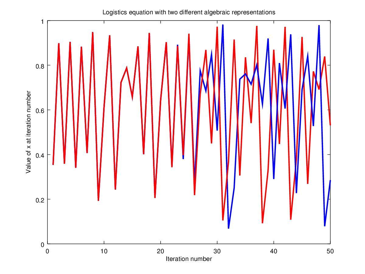 The limitations of computers can be even more subtle. Most simulations, and dynamical systems in particular, rely on feedback to generate states and evolve systems to predict future behavior. A simple dynamical system that does this is the logistic equation: \[ x_{i+1} = r x_{i}(1-x_{i}) ; i = 1, 2, \ldots, \]which you can implement easily to see the evolution of the variable \( x \). Because the logistic equation is chaotic for certain values of \( r \), initial conditions of, say, \( x_{1} = 1.5 \) or \( x_{1} = 1.50005 \) are expected to yield different trajectories. This is the idea of sensitive dependence on initial conditions, a fundamental behavior of chaotic systems.