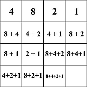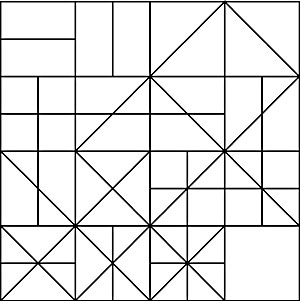 Under Magic squares we find Cipra's observation that assigning binary digits 1 or 0 to indicate presence or absence of vertical, horizontal, up diagonal, down diagonal segments gives each tile a different number from 0 to 15. A solution to Loren's limerick gives a semi-magic square with row and column sums, but not necessarily diagonals, each equal to 30.