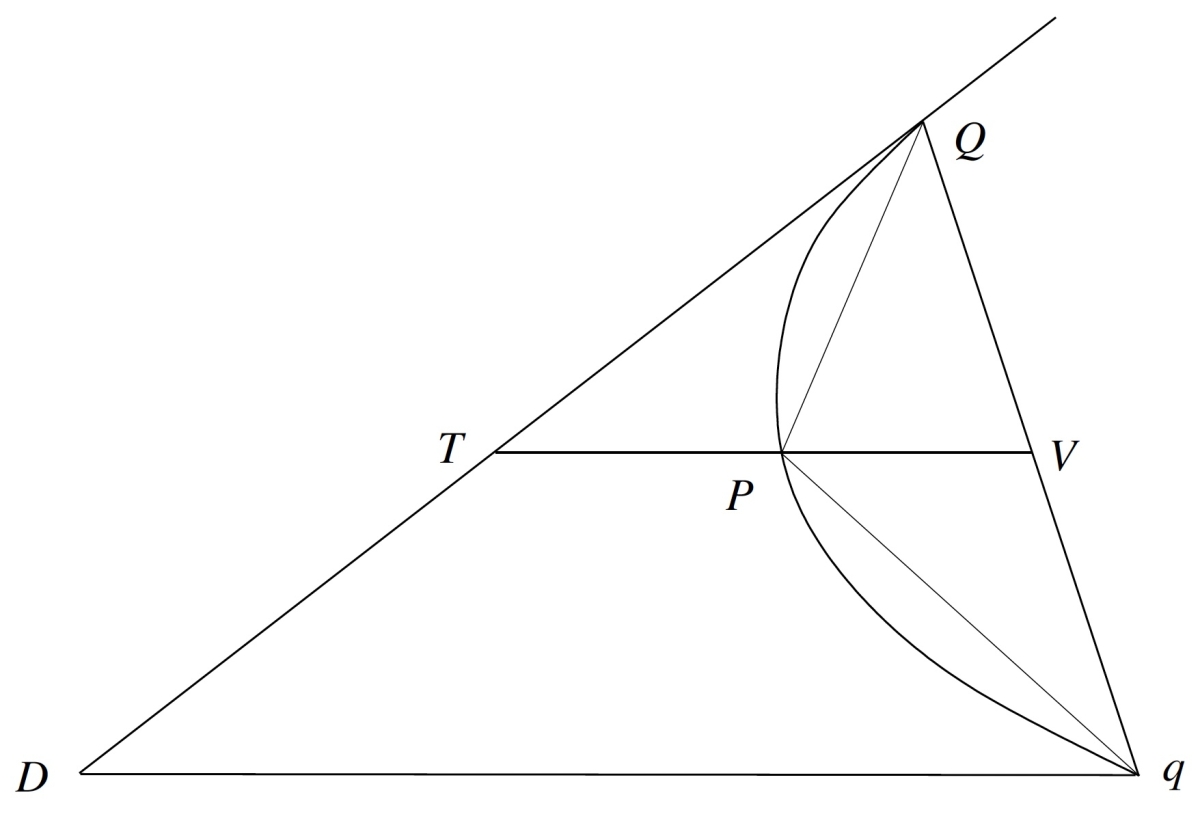 Then \(\frac{1}{4}\triangle DqQ=\triangle QPq\). Why? Proposition I.35 of the Conics of Apollonius of Perga (262-190 BCE) [Apollonius, p. 62] shows that \(TP=PV\). Thus, triangles \(\triangle TQV\) and \(\triangle QPq\) have the same area. A similarity argument shows that \(\triangle DqQ\) has four times the area of \(\triangle TVQ\). Thus, \(\frac{1}{4}\triangle DqQ=\triangle QPq\), and so to show that \(area(Parab(QPq))=\frac{4}{3}\triangle QPq\), it is necessary and sufficient to show that \(area(Parab(QPq))=\frac{1}{3}\triangle QDq\).