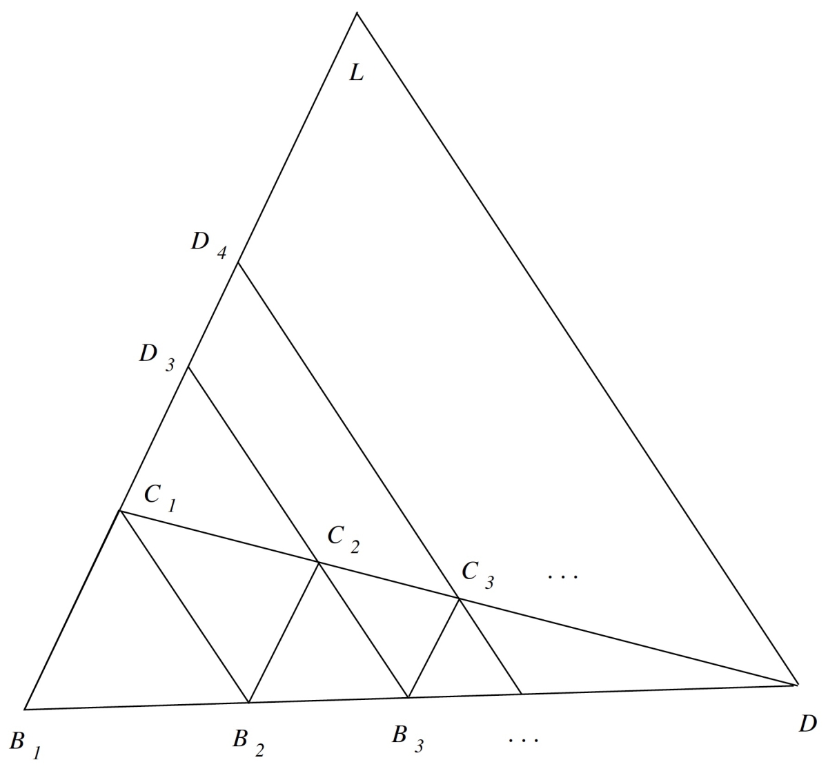 Torricelli's second and most important result about the flexilineum was the derivation of a geometrical representation for the sum of the lengths of the infinitely many line segments \(B_iC_i\). To find this sum geometrically, he extended each of the segments \(B_{i+1}C_i\) so that they intersected the extension of \(B_1C_1\) in a point we will call \(D_{i+1}\). (Note: \(D_1=B_1\) and \(D_2=C_1\) by definition as well.) Similarly, he let the line parallel to all the \(B_{i+1}C_i\) and passing through \(D\) intersect the extension in a point \(L\).