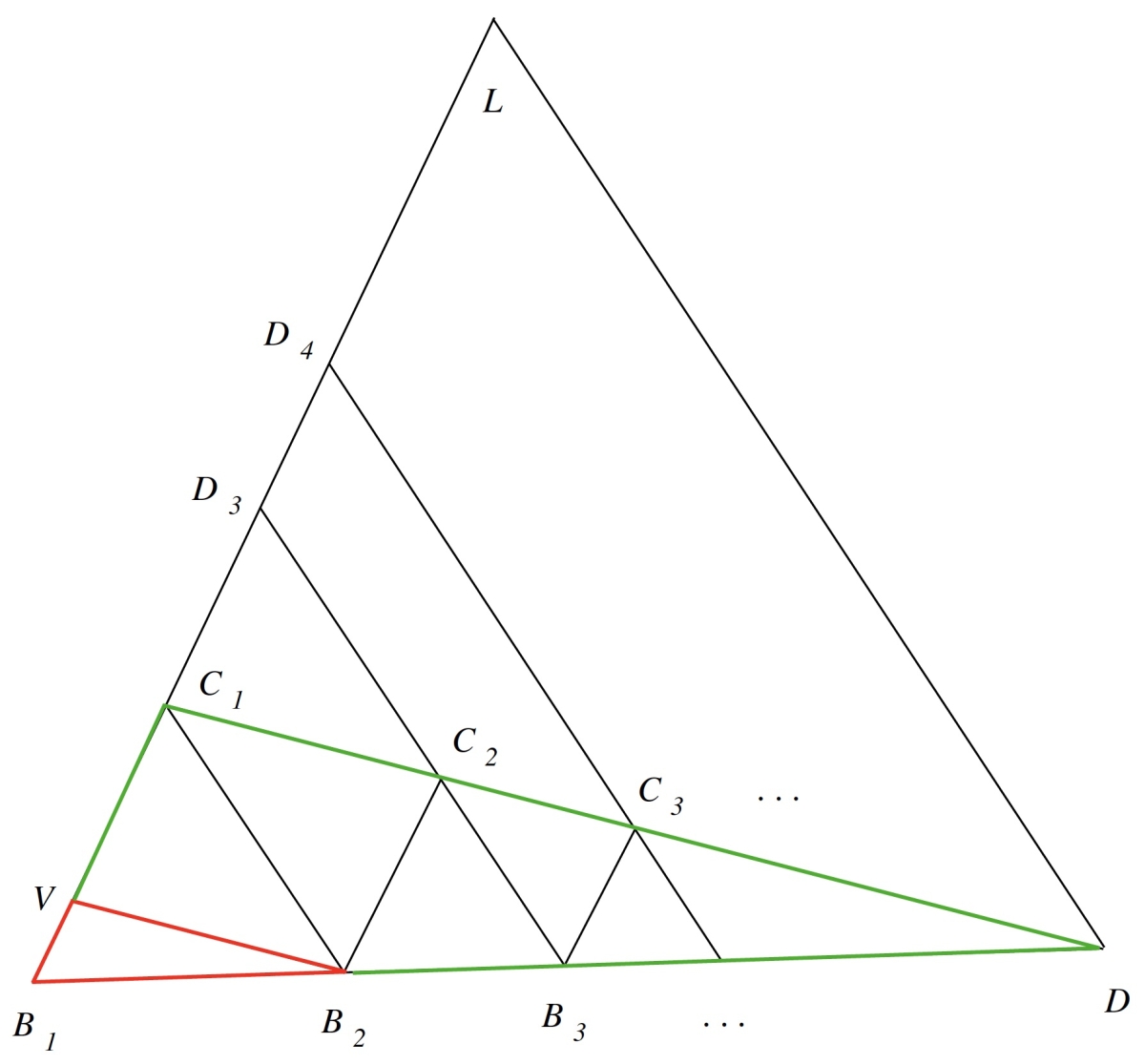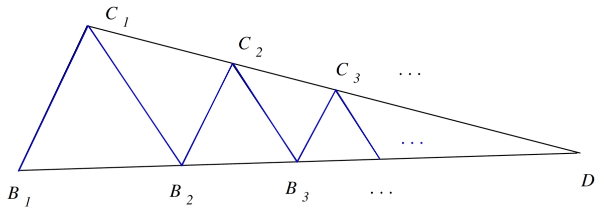 To justify this infinite summation Torricelli introduced a geometrical figure he called a flexilineum, which was constructed as follows: Consider two lines \(B_1D\) and \(C_1D\) that intersect at \(D\), and a sequence of points \(B_1,B_2,\dots\) on \(B_1D\), and \(C_1,C_2,\dots\) on \(C_1D\) such that for \(i=1,2,\dots\) the segments \(B_iC_i\) are mutually parallel, as are the segments \(B_{i+1}C_i\). The flexilineum consisted of the infinitely many conjoined segments \(B_1C_1B_2C_2\dots\).